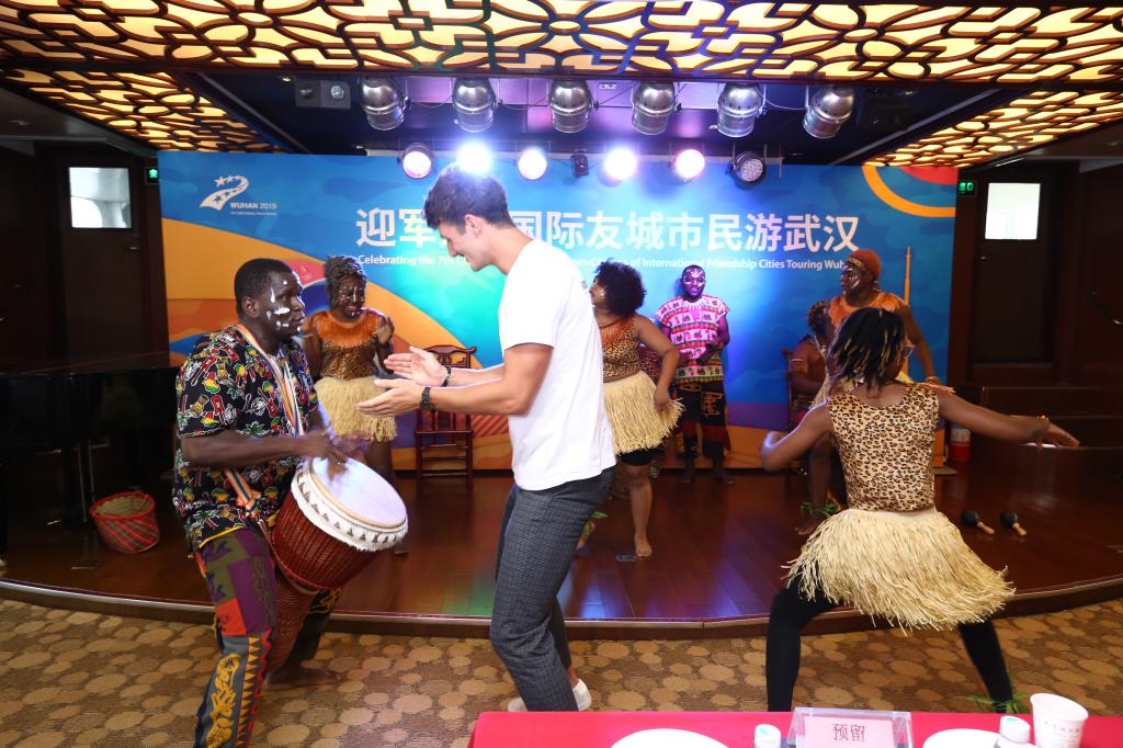 (通讯员:杨素 赵阳平)7月16日晚,由武汉市人民政府主办、武汉市人民政府外事办公室承办的“迎军运·国际友城市民游武汉-夜赏长江”活动在汉口江滩牡丹号游轮上举行。武汉国际友好城市代表、外国驻汉机构代表、在汉外国专家代表、外国留学生代表200余人欢聚一堂、赏江城美景、品楚风汉韵。我校来自贝宁、刚果(布)等国的20名国际学生和武汉芳华爱乐团等单位受邀参加游轮文艺演出。由我校选送的非洲鼓表演“非洲节拍”、男女生合唱“我相信你”、孟家拉独舞“春之歌”等节目收获友城市民的热烈掌声,许多观众上台跟随激情飞扬地鼓声一起欢快舞蹈,将晚会的气氛推向高潮。