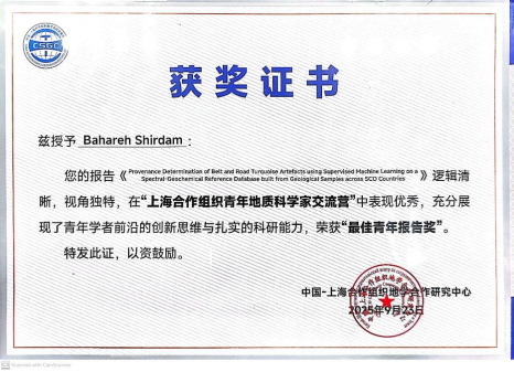 副校长夏帆作为特邀颁奖嘉宾,为大会颁奖,我校伊朗籍国际学生BAHAREH SHIRDAM荣获“最佳青年报告奖”。夏帆为获奖学生颁奖,希望全体参会学子以此次交流营为契机,继续加强跨国家、跨文化协作,成为上合组织地学合作的青年使者。